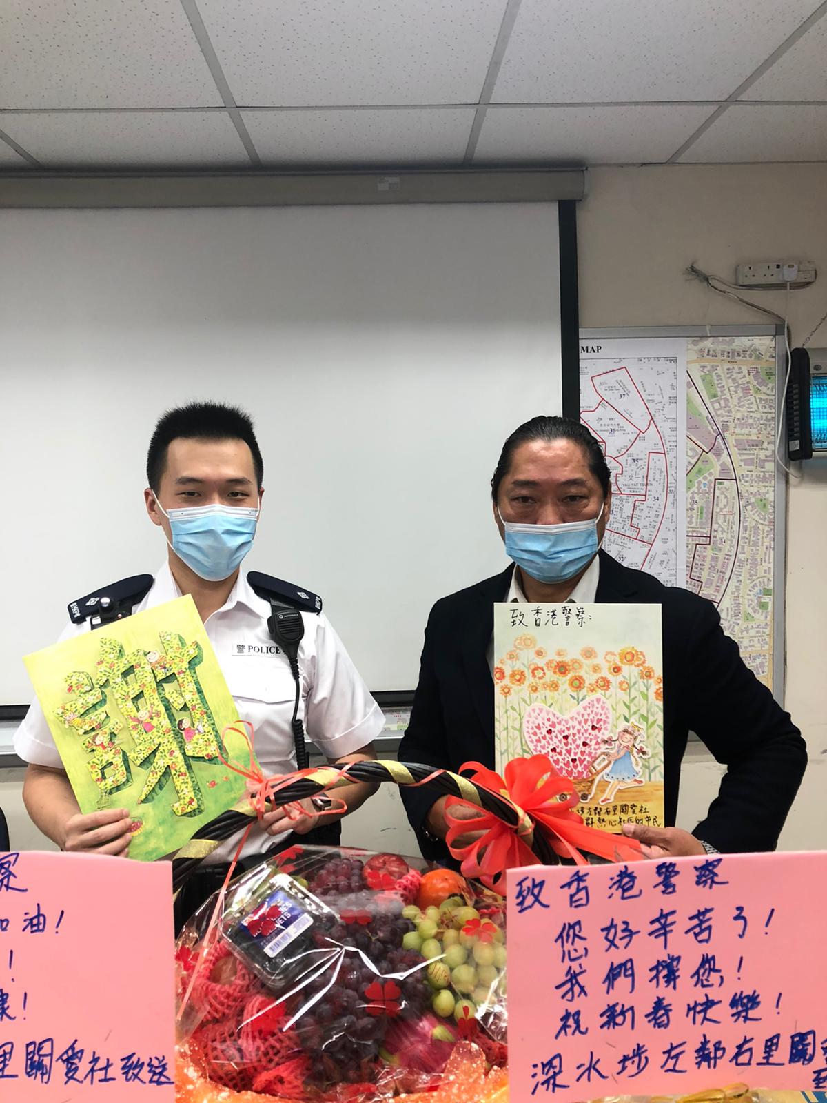 深水埗左邻右裏关爱社日前走访慰问深水埗警署,民建联深水埗区议员刘佩玉、深水埗市民代表秦文荃等感谢警署警员的辛苦付出,并祝全体警员身体健康,新春快乐。深水埗警区警民关係组社区联络主任郑锦鸿接待了慰问团,接受了他们赠送的水果、矿泉水和手绘贺卡。图为刘佩玉(左四)、秦文荃(左三)等代表辖区市民感谢警署警员辛苦付出。