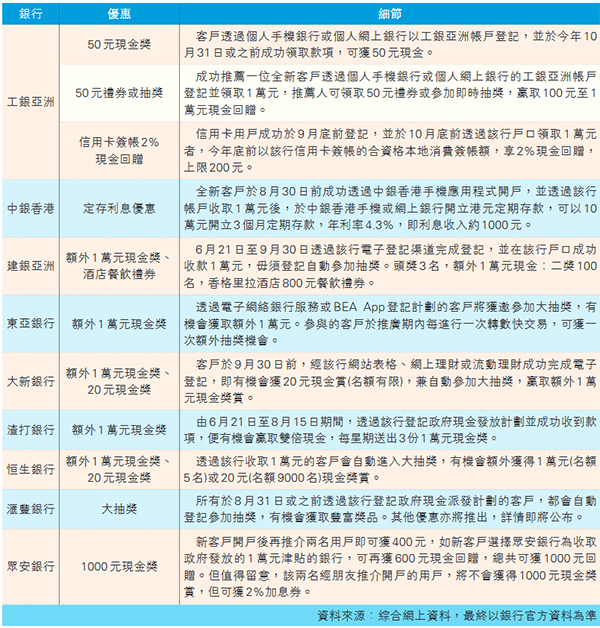 不少银行已蠢蠢欲动,準备「瓜分」这笔资金。截至昨日截稿,最少已有9家银行宣布推出包括抽奖和现金回赠等优惠,以鼓励客户透过该行登记领取1万元,包括中银香港(2388)、工银亚洲、建行亚洲、东亚银行(023)、大新银行(2356)、渣打银行、恒生银行(011)、丰银行及众安银行。