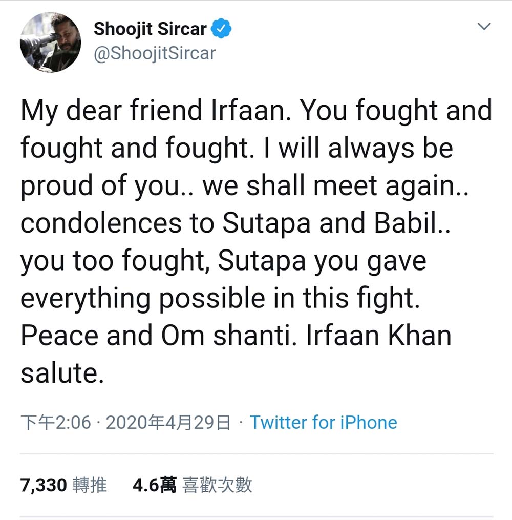 多位明星、导演纷纷在网上发文悼念,缅怀伊凡・卡汉的演艺人生。製作人Shoojit Sircar在Twitter讚赏伊凡卡汉, 一直努力与病魔战斗,永远以你为荣,他日再聚。